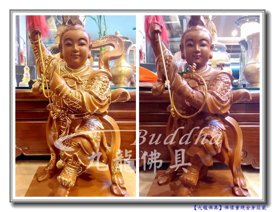 鄭師姐家另一尊太子,因為搬家的時候不小心撞斷了雲帶,龍師傅當然修復到看不出痕跡。太子的金身也採用描金的方式呈現戰甲,使得整尊太子容光煥發,立體感更加深,顯得更有靈動力。
