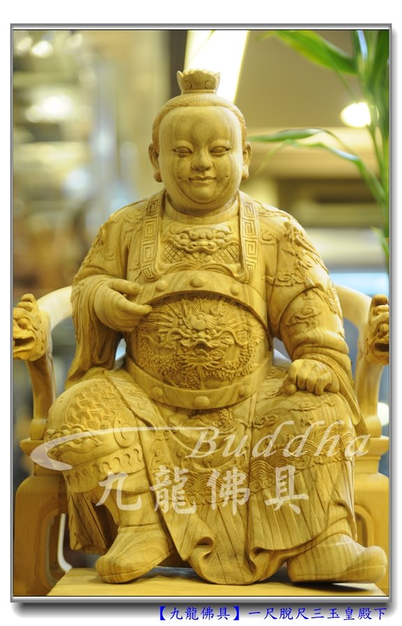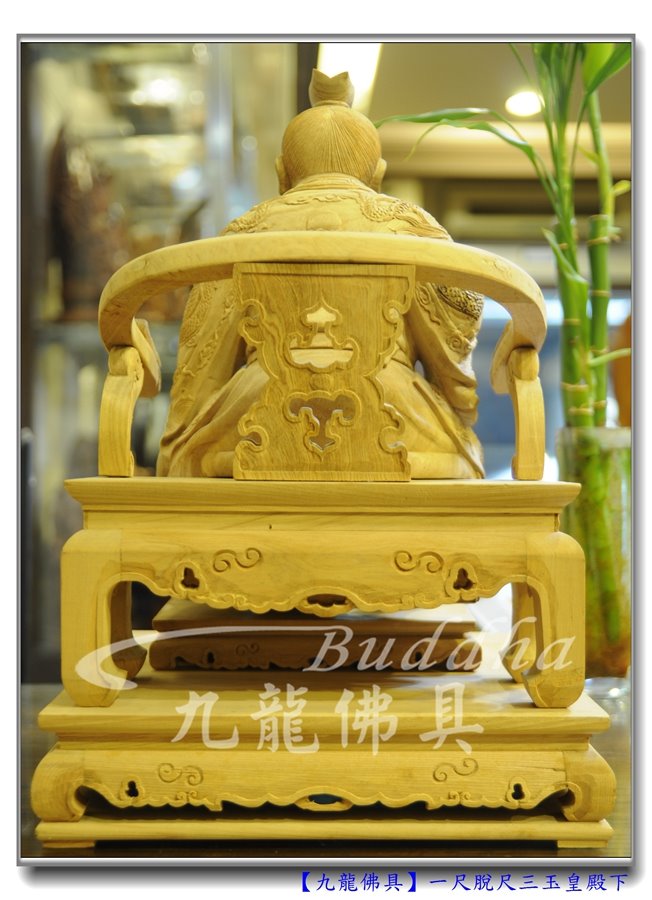 玉皇殿下身長一尺,坐上檜木脫椅後是一尺三高。特選的樟木,木頭的木節少紋路又漂亮,質量也很穩定。漂漂亮亮的白身神尊,期待有緣人來為神尊設計不同凡響的色彩。