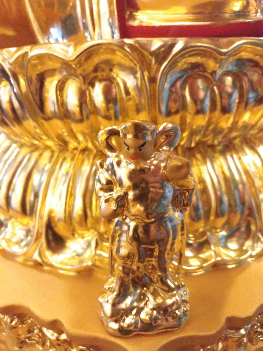 舟形毫光,尖頂向上做延伸,上有九龍二鳳。毗盧觀音坐像,法像莊嚴,眼神向下視,全身漆金閃閃發光,連同後面的金龍燦爛耀眼,表示無量光明。