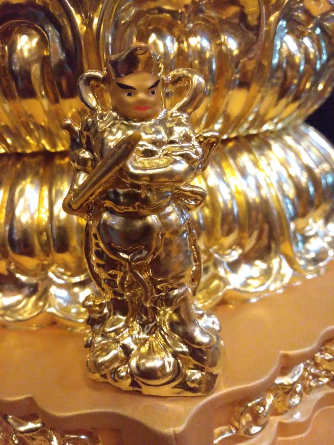頭戴五瓣毗盧五佛帽,正中間是毗盧遮耶佛,即是大日如來。另四瓣的坐佛則在觀音蓮座的前後。蓮座上層四方,立著四尊小形護法神,分別為東方持國天、西方廣目天,南方增長天、北方多聞天等四大天王。