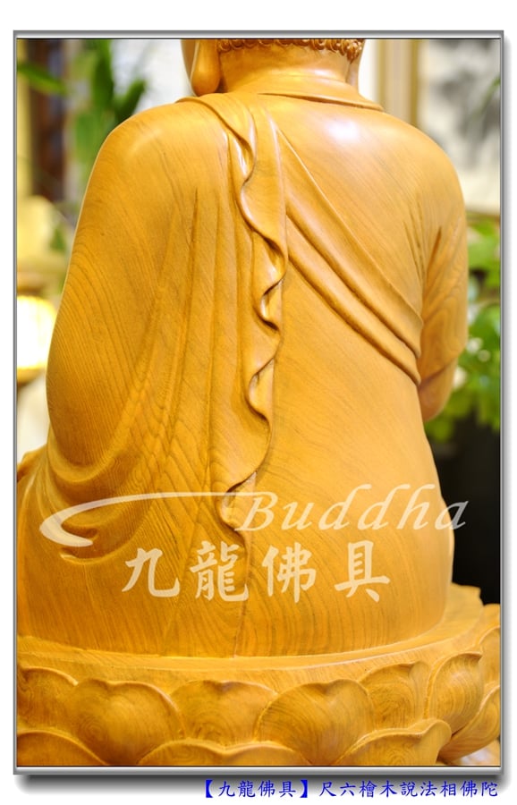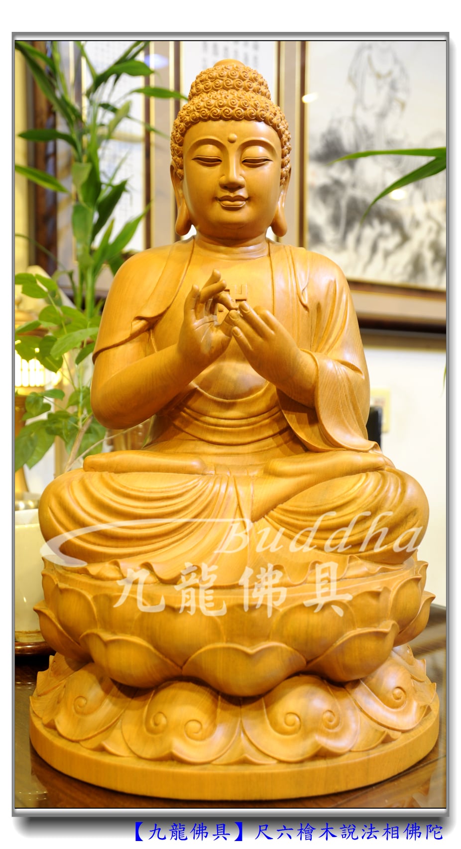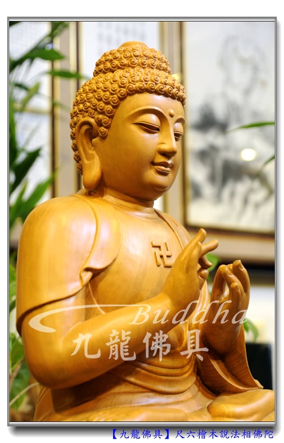 這尊說法相的釋迦牟尼佛,由檜木雕刻而成,佛陀的手以姆指與食指相捻,兩手置於胸前,為其弘法釋道時的法相。