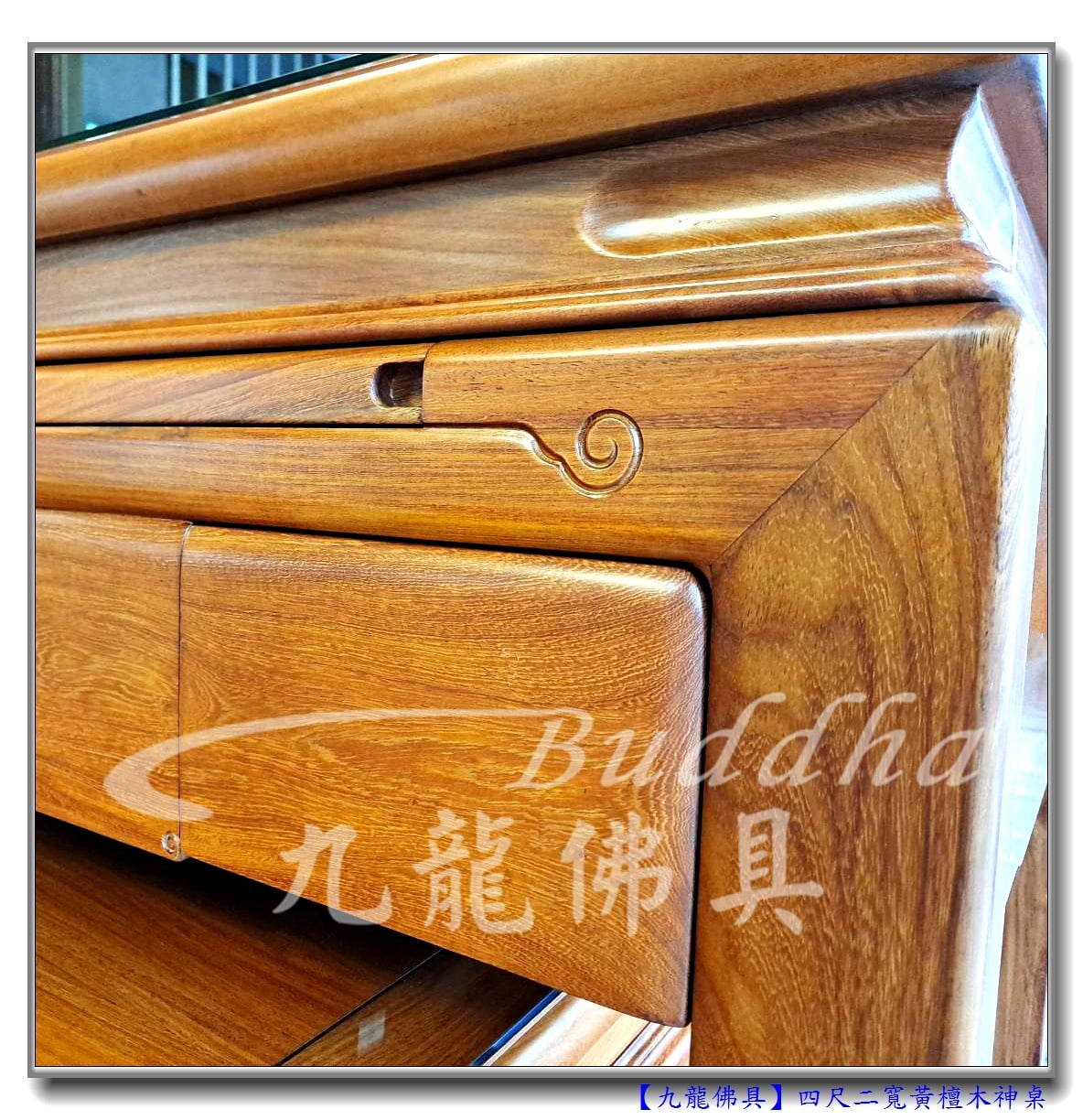 這佛桌其實不是黃師兄要的,但黃師兄是扮演什麼角色呢?原來一切都是黃師兄所設的妙蓮寺九龍太子指示的九龍太子指示分靈八尊,將供奉於有緣人家。而這張漢式呈祥黃檀佛桌是其中一位有緣人要添購的。經由黃師兄在寺裡擲杯求問九龍太子,才一切底定。