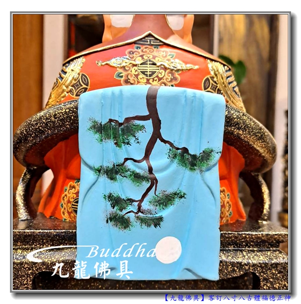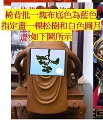 福德正神的椅背有很特別的彩繪,是林師兄指定要有藍色布底上繪圖松樹與明月之倒影