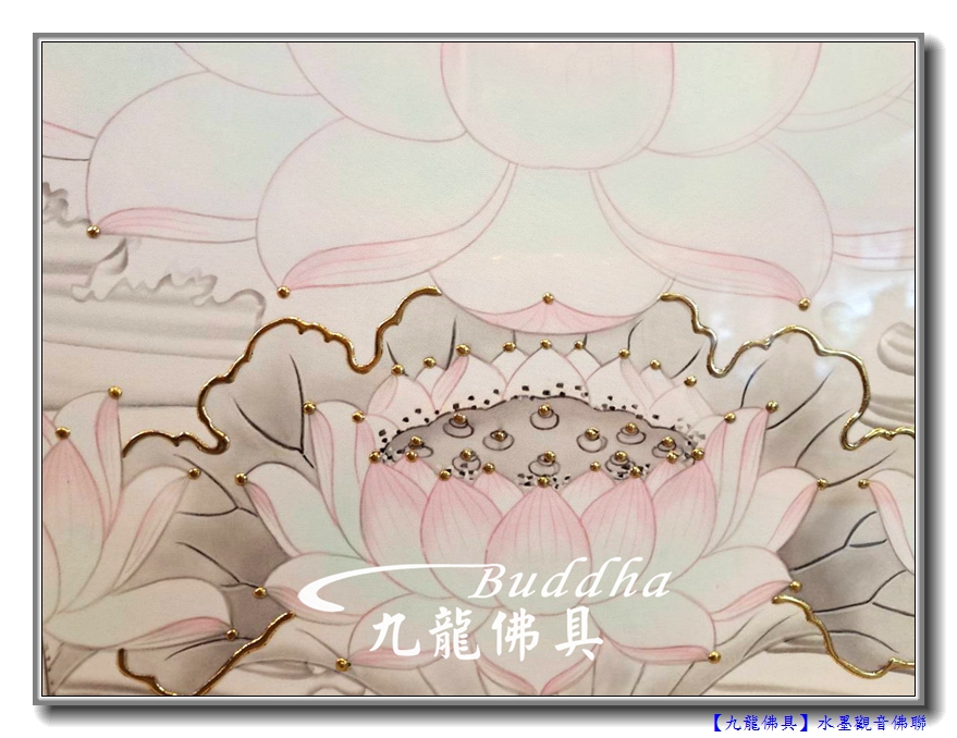 觀音蓮座下的蓮花是添上淡淡粉嫩的粉紅色,維持花朵應該有嬌豔,在整幅佛聯裡又不是太搶眼的色彩,反正增添了觀音菩薩慈悲為懷的親近感。
