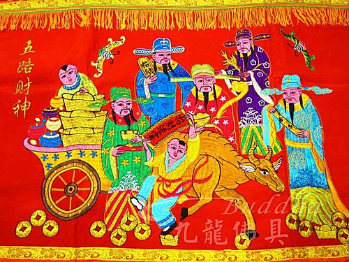 色彩層次豐富,繡工細緻神明用桌圍桌裙~五路財神快進宅,金元財寶通通來。